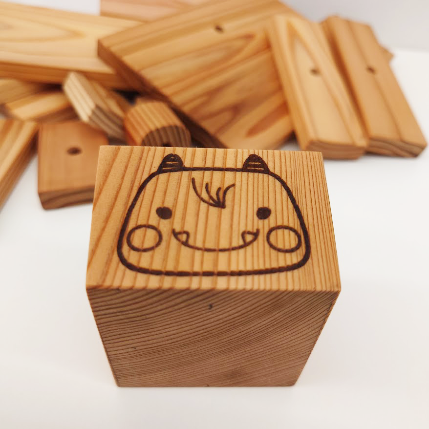「伐(きる)」から「遊(あそぶ)」へ。 役目を終えて伐採された柏崎杉が、子どもたちの宝物として生まれ変わりました。 杉は特有の香り、一つひとつ異なる美しい木目が特徴です。